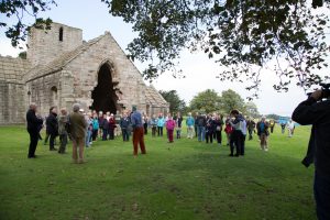 On Friday 9th we visited Hume Castle, following a very expert talk by Dr Piers Dixon about the archaeology at the site. We were delighted to be entertained by a historical re-enactment and another archaeological talk from Dr Hill whose excavations had just started at the graveyard. We were very fortunate then to be joined by pipers and drummers from the Scottish Gunners who played for us. A hog-roast lunch was followed by a visit to the graveyard where Gos and Diana Home lead us in a memorial service to mark the centenary of the 1914-18 war. After a display of pipes and drums by the Scottish Gunners at Duns Castle, the evening concluded with a meal at the excellent Allanton Inn, except for a small party which joined revelry and dancing at the Coldstream Civic Week Dinner.